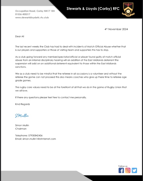 In light of recent events, Chairman Simon Mullin has written a letter to all Club Members in regards to Match Official abuse. The Club has had to put in place further action to prevent MOA from reoccurring. You can find the letter below: